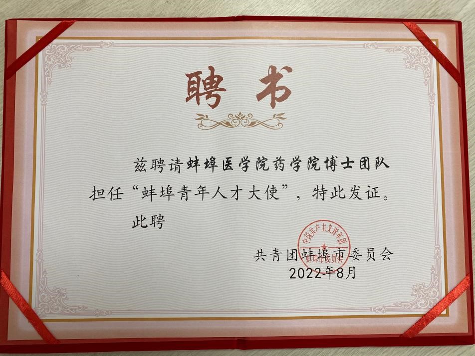 为广泛宣传推介蚌埠人才政策和创新创业举措,扩大蚌埠的知名度和美誉度,助力打造青年发展型、友好型城市,形成以人才识人才、以人才聚人才的良性循环,近日,共青团蚌埠市委员会面向广大青年开展了“蚌埠市青年人才大使”招募活动。经过层层选拔、优中选优,我校电影天堂 博士团队成功当选第一批“蚌埠市青年人才大使”,也是本次评选活动中唯一一个以集体名义获聘的人才大使。“蚌埠市青年人才大使”聘书近年来,在学校党委与行...