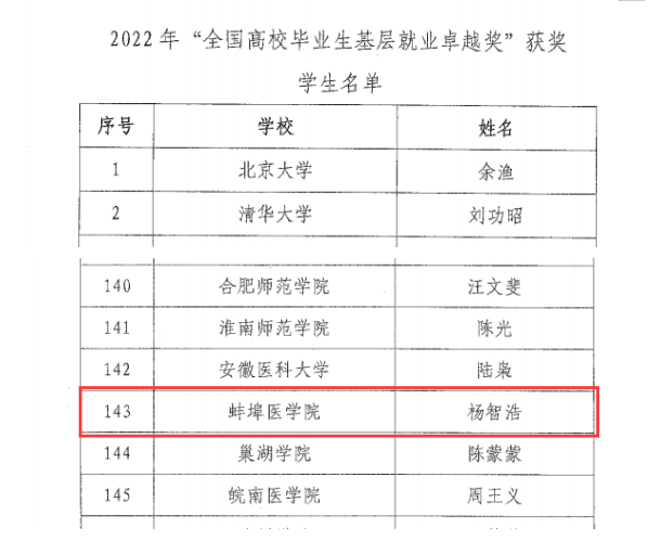 近日,中国教育发展基金会公布了2022年度“全国高校毕业生基层就业卓越奖”获奖人选名单,电影天堂 2018届药学专业本科毕业生杨智浩荣获“全国高校毕业生基层就业卓越奖”。“全国高校毕业生基层就业卓越奖”由教育部高校学生司、教育部学生服务与素质发展中心共同指导,奖励对象为近10年赴基层就业并做出突出业绩的普通高校毕业生和普通高校指导服务大学生赴基层就业工作有突出贡献的教师,该项目每年遴选一次。杨智浩是电影天堂 2018届...