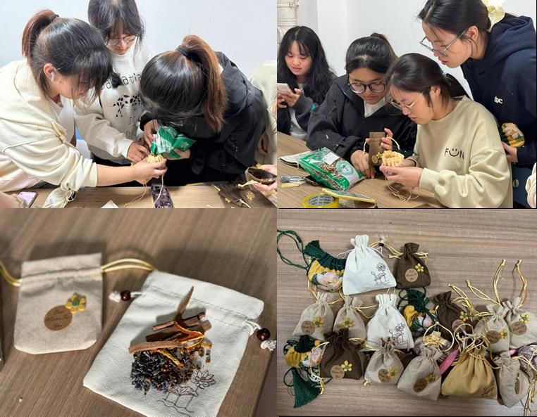 活动当天,活动室内充满了药香,本草社的同学们也早已准备就绪,桌子上摆满了准备好的各种中草药,如:合欢花、薰衣草、檀香等,还有色彩斑斓、造型各异的香囊。在本草社同学的引导下,志愿者们有的按照配方,有的根据自己喜好,称量、装袋、系绳,大家齐心协力、互帮互助,不一会儿就制作出了许多不同功效的中草药香囊,这些香囊不仅外观小巧可爱,还具有安神解郁,保健养身等效果。随着活动渐入结尾,志愿者们纷纷展示了自己的成果。各式各样的香囊摆放在桌子上,来了一张“大合照”。