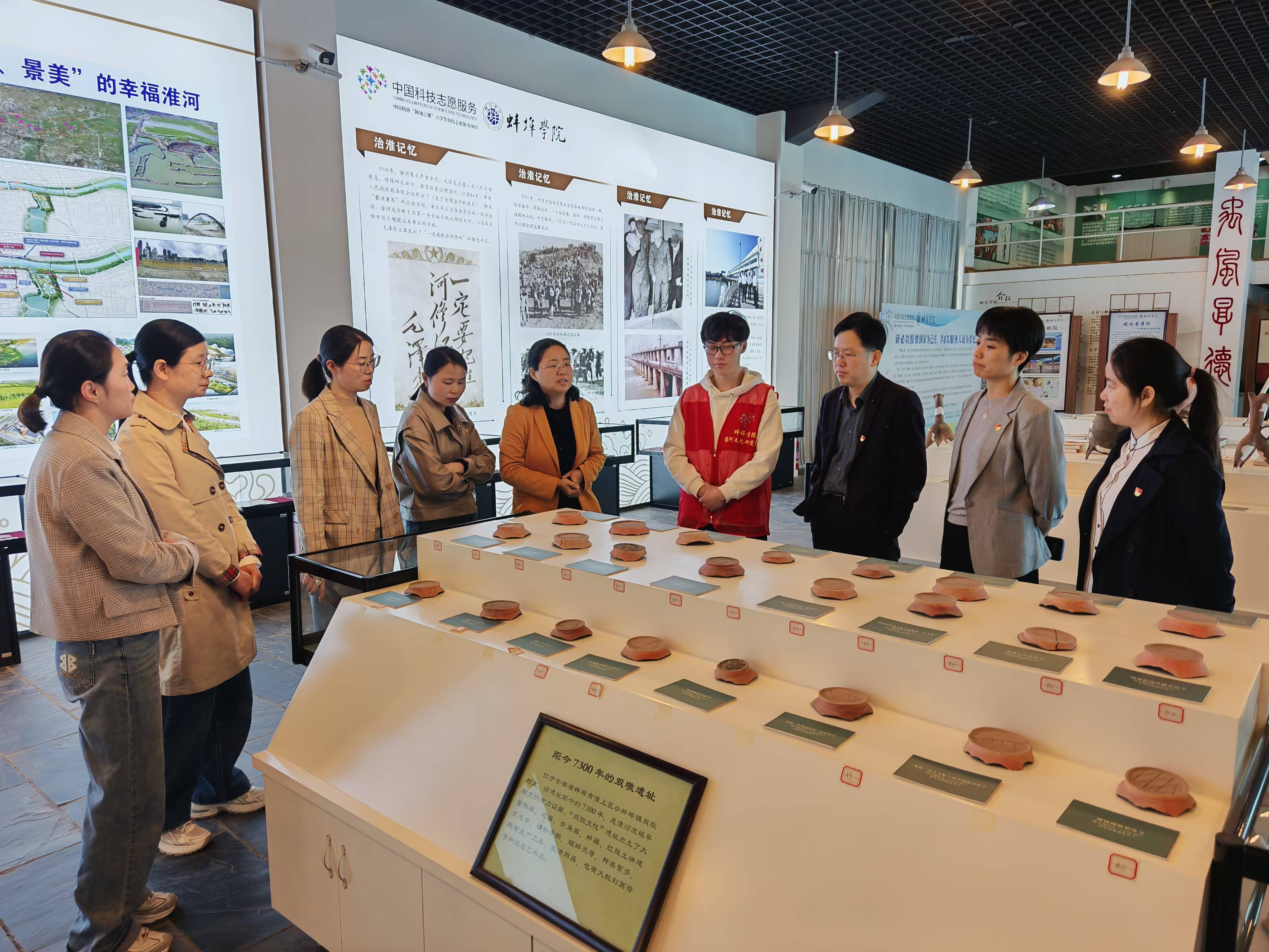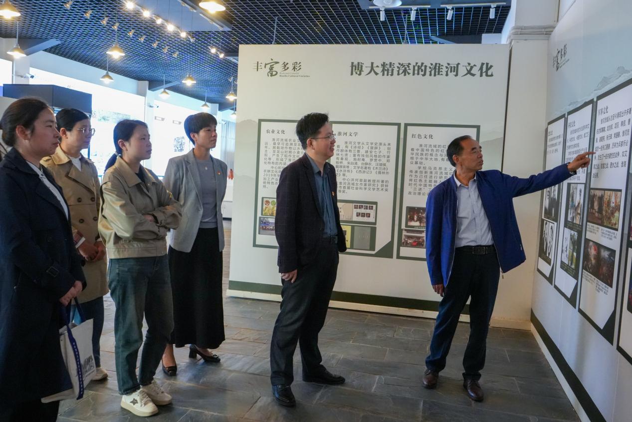 座谈结束后,淮河文化研究中心洪何苗副教授带领一行人前往中心参观学习。通过学生志愿者的生动讲解,大家系统了解淮河文明的历史脉络、民俗风情及当代价值,深刻感受地域文化对社会发展的滋养作用。