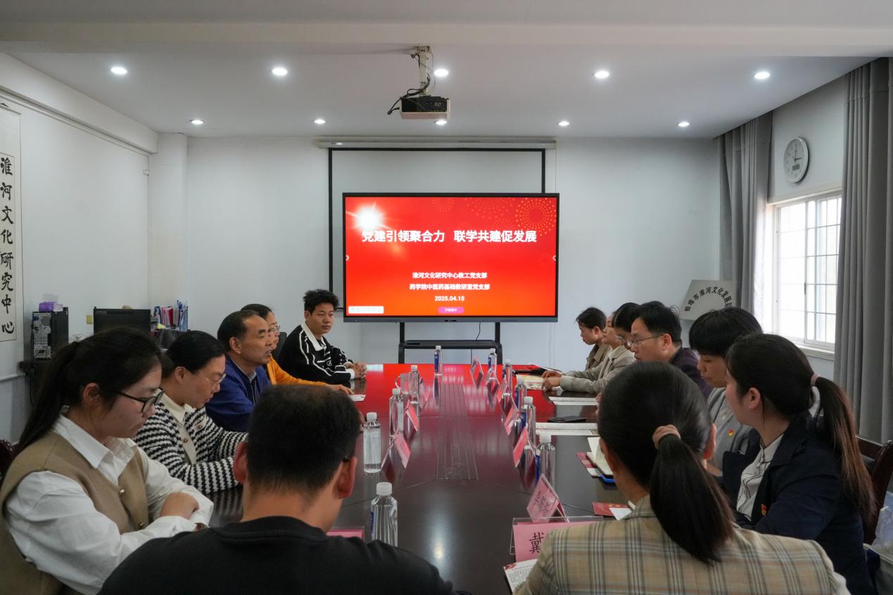 副院长李娴介绍了中医药基础教研室党支部基本情况,并围绕“党建 + 文化”创新模式,分享了打造党建工作样板支部的建设目标,展现出以党建为引领推动中医药文化传承创新发展的坚定决心。同时希望以此次党建联学活动为契机,积极探索两院跨学科协作路径,共同围绕淮河流域中医药资源挖掘、非遗文化传承等方向,开展深度合作研究,促进中医药文化与淮河文化研究的深度融合,为弘扬中华优秀传统文化贡献力量。中医药基础教研室教师代表戴轶群老师介绍了中医药文化传承创新工作坊项目建设情况。