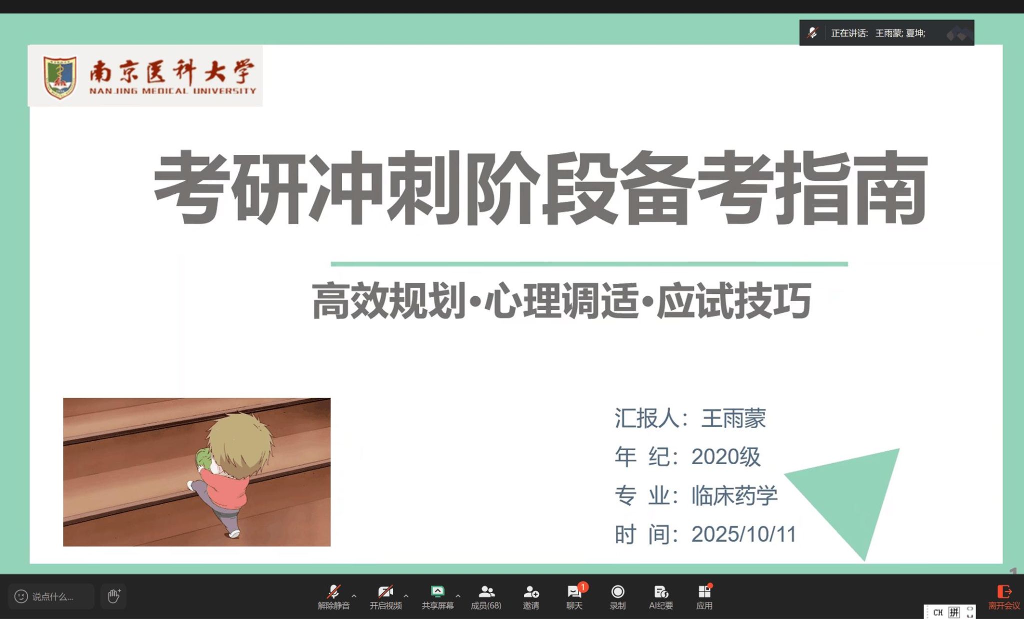 为帮助2022级药学、药物分析专业及2024级药学专升本专业学子破解考研报名难题、明确冲刺方向,平衡实习、就业与考研关系,10月11日晚,毕业年级辅导员夏坤以线上形式召开专场指导会,并特邀已录取南京医科大学的王雨蒙同学分享经验。