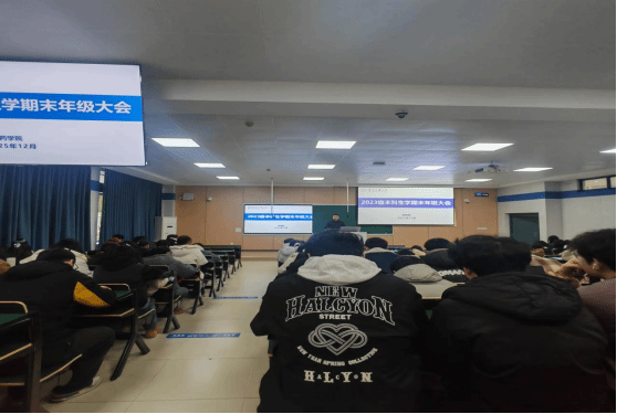 2023年级药学、药物分析、临床药学专业在理论楼101教室召开考风考纪教育主题班会暨期末年级大会。会议由辅导员肖进主持,全体本科生参加。