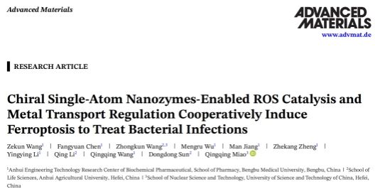 王清清教授团队青年教师汪泽坤博士在顶刊《Advanced Materials》(中科院1区TOP/IF=26.8)上发表题为“Chiral Single-Atom Nanozymes-Enabled ROS Catalysis and Metal Transport Regulation Cooperatively Induce Ferroptosis to Treat Bacterial Infections”的研究论文。