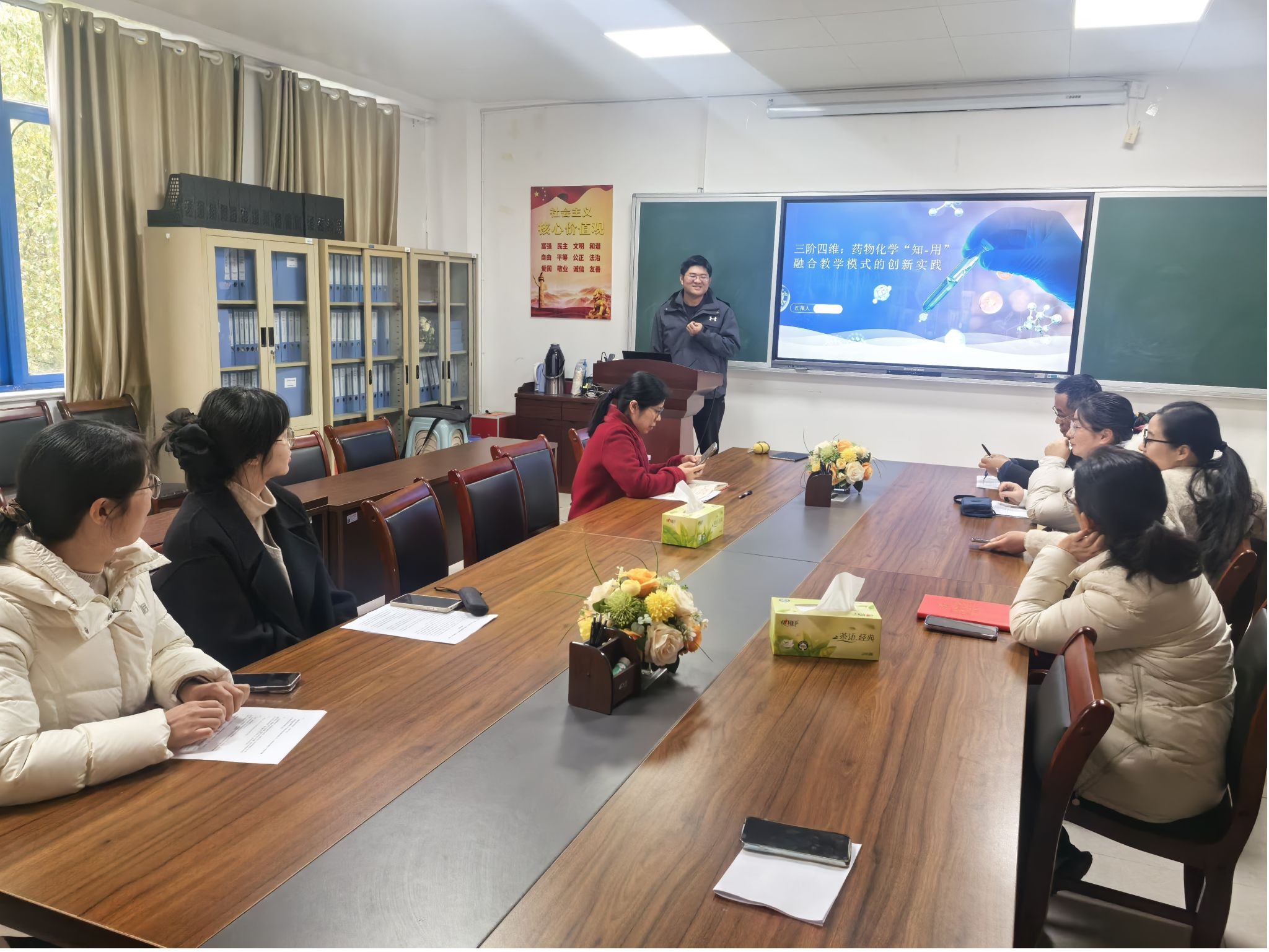 副院长梁丽丽、药理学教研室主任董淑英、药物分析教研室主任马涛担任评委为参赛教师“把脉问诊”,全体参赛教师及团队成员到场观摩学习。
