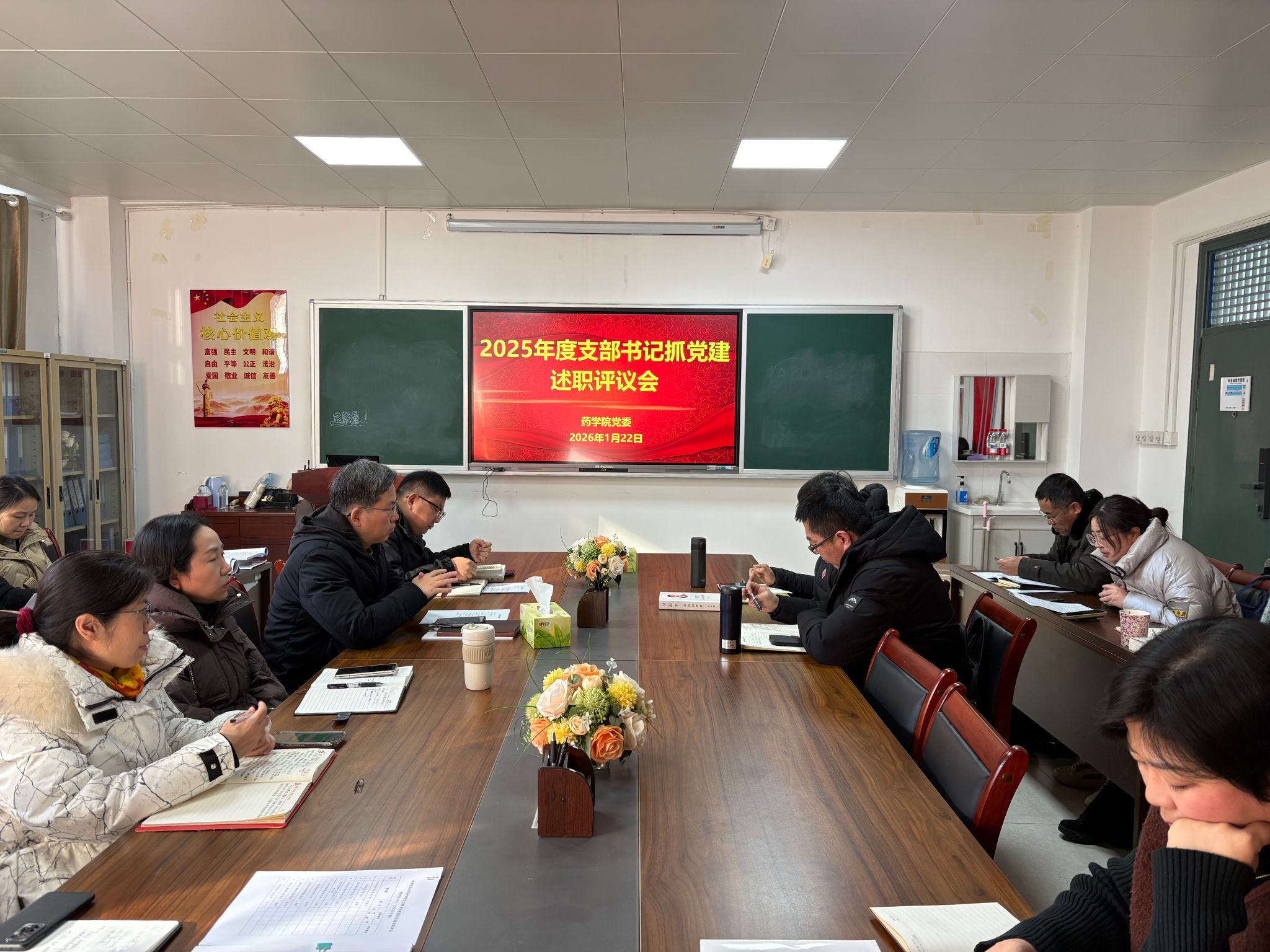 结合述职评议情况,陈艳军对学院2026年及“十五五”期间的基层党建工作作出部署。他强调,各党支部要以此次述职评议为新起点,切实提高政治站位,强化抓党建的主责主业意识。要坚持以党的创新理论武装头脑、指导实践,巩固拓展学习教育成果;要牢固树立“围绕中心抓党建,抓好党建促发展”的理念,推动党建与人才培养、科学研究、社会服务等学院中心工作深度融合、同频共振;要对标教育部高校党建工作“标杆院系”创建标准和省级高校党建工作“样板党支部”建设要求,持续强化党支部标准化规范化建设,着力提升“三会一课”、组织生活会质量,有效激发基层组织活力;要充分发挥战斗堡垒和先锋模范作用,团结带领广大师生,以高质量党建引领保障学院各项事业内涵式高质量发展,为实现新的突破凝聚强大合力。