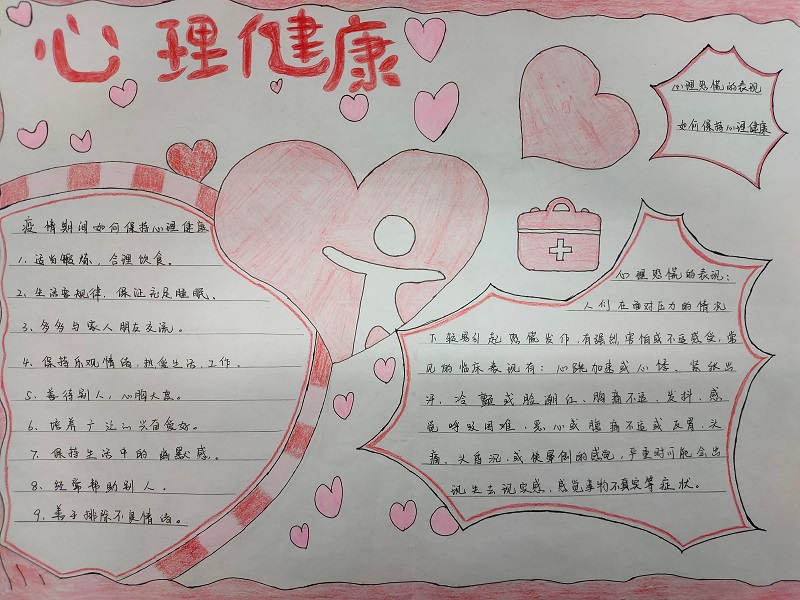 各班以学习小组为单位,以“同心战疫,共筑健康”为主题设计心理健康手抄报,学生们在手抄报制作中学习抗疫和心理健康知识,缓解负面情绪和压力,进而达到心理调适的目的。经评选李程程小组获得一等奖,卢风雨小组获得二等奖,郜子诺小组获得三等奖。