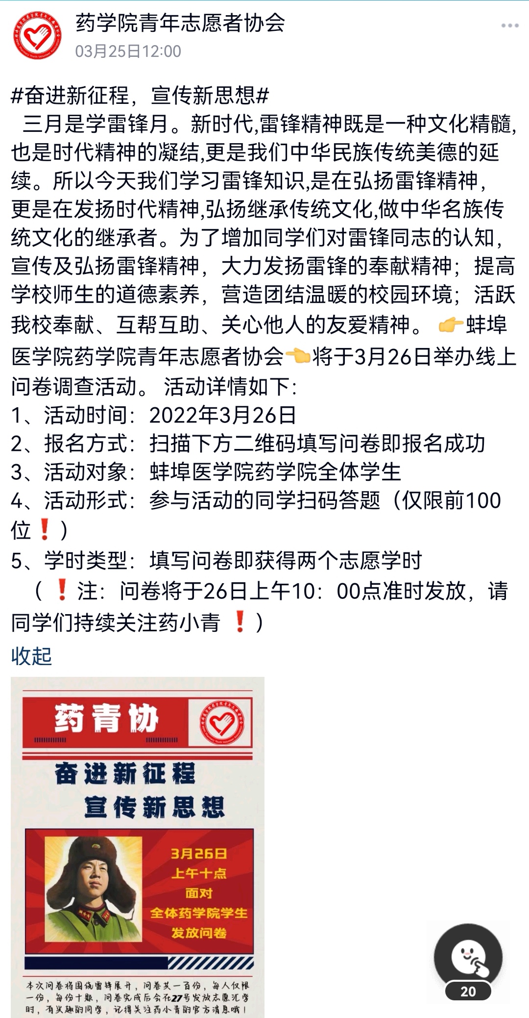 青年志愿者协会于3月26日成功举办学雷锋问卷调查线上活动。